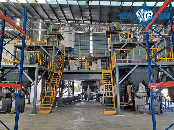 該套生產線在全自動干粉砂漿生產線的基礎上,增配針對玻化微珠物理特性專門研制的離心式滾筒混合機及高效專用體積打包機(敞口包裝機可選)。該套生產線效率高、產量大、適用性強、操作性好。該套設備實現多點除塵處理,工作環境好,有力保障員工身心健康,創造高效清潔的生產環境。