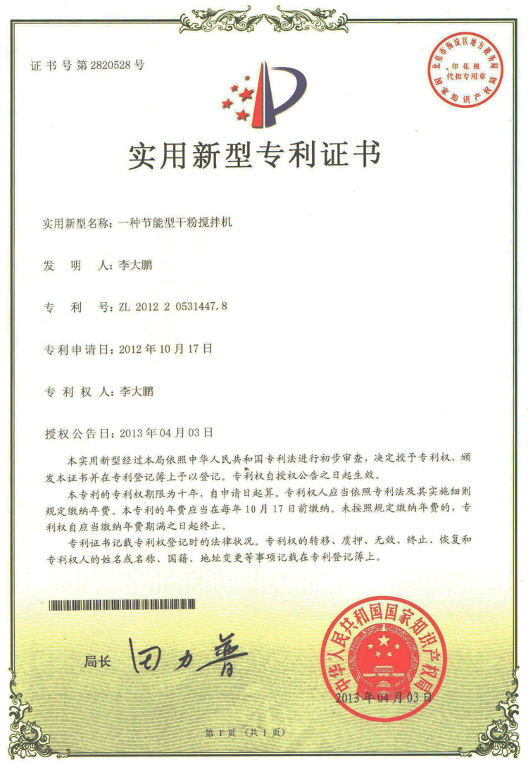 上一篇:干粉攪拌機外觀設計專利證書